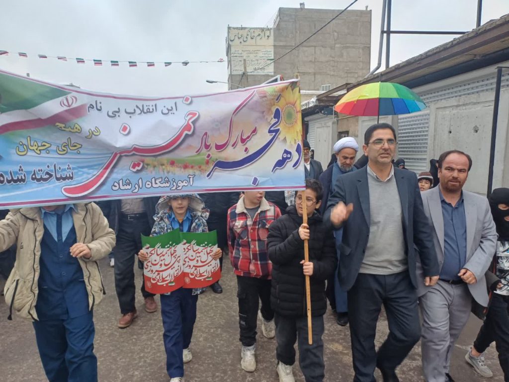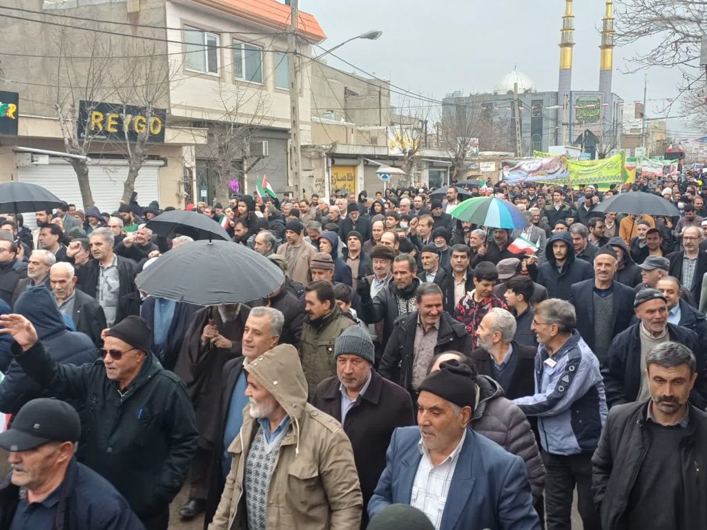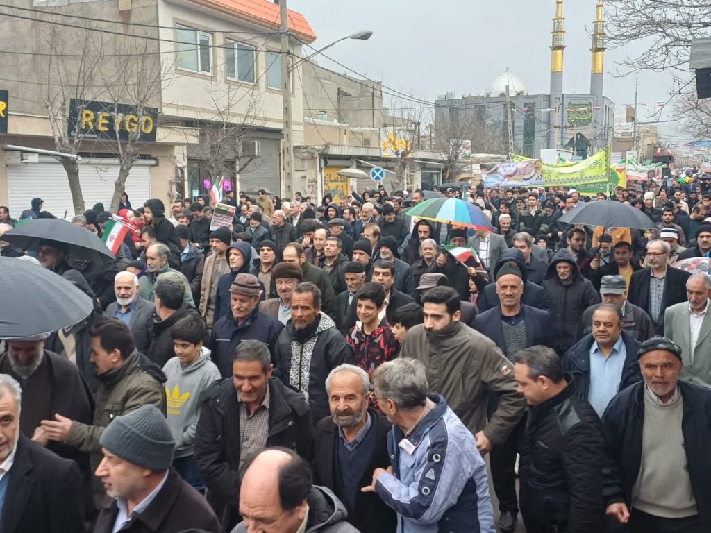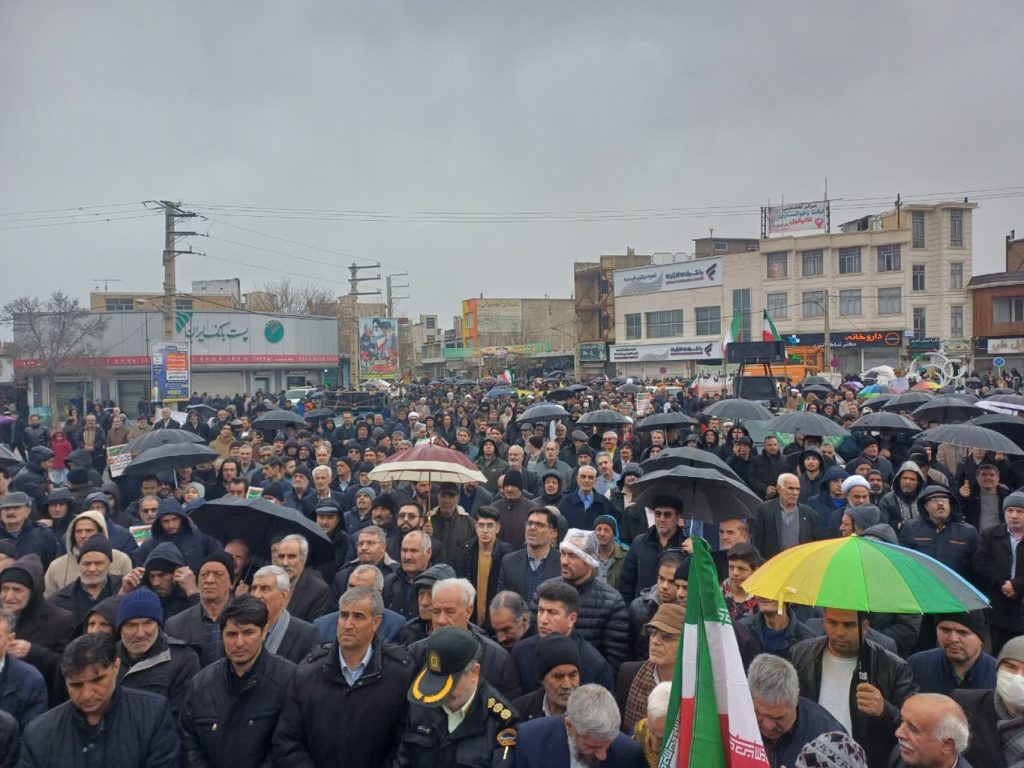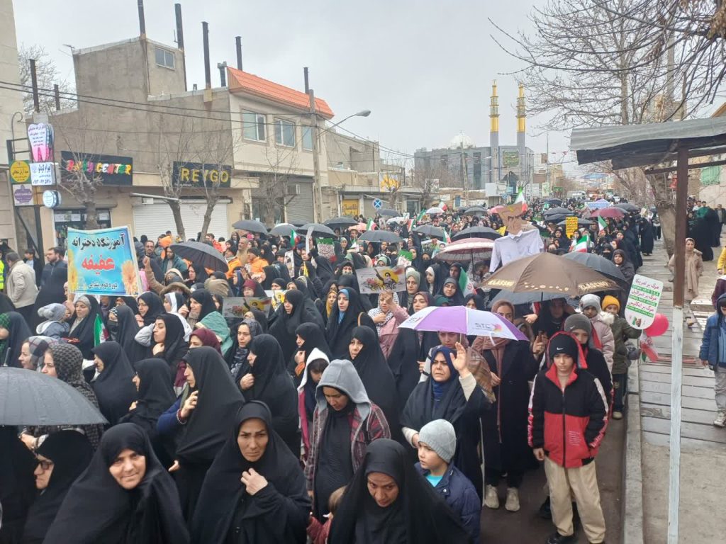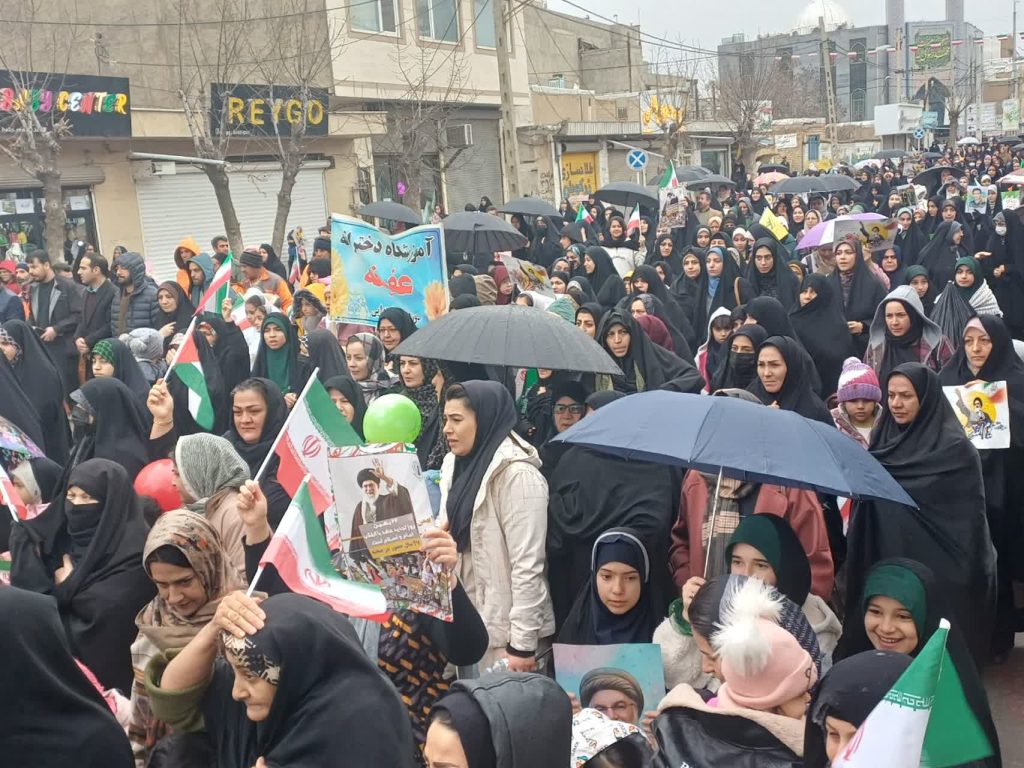قطرات باران بر دوش مردمی می‌نشست که استوار و یک‌صدا در راهپیمایی ۲۲ بهمن حضور یافتند تا بار دیگر بر پایبندی خود به ارزش‌های انقلاب اسلامی تأکید کنند.